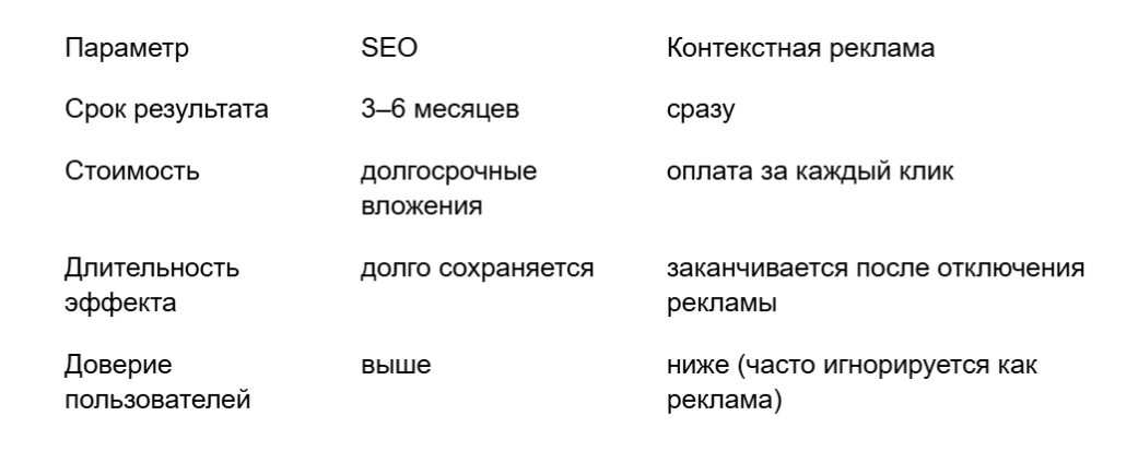 Многие путают SEO с контекстной рекламой (Google Ads или Яндекс Директ). Разница в том, что реклама работает по принципу «платишь — показываешься». Как только вы перестали платить, ваш сайт исчезает из выдачи. В то время как SEO — это инвестиция в долгосрочную стратегию. Ваш сайт продолжит показываться в органической выдаче, даже после того как вы перестали инвестировать в SEO.